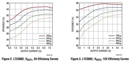 在圖 1 的解決方案中,兩個輸出的 V IN 引腳和頂部 MOSFET 的漏極連接到相同的輸入電壓 V IN。但是,如果需要,這三個端口可以連接到不同的電壓或電源。設(shè)計人員可以通過 V IN引腳對 LTC3892 進行偏置 ,并將來自不同源的電壓施加到 Q1 或 Q3 的漏極。圖 2 和圖 3 顯示了圖 1 中的轉(zhuǎn)換器在各種輸入電壓下的效率。