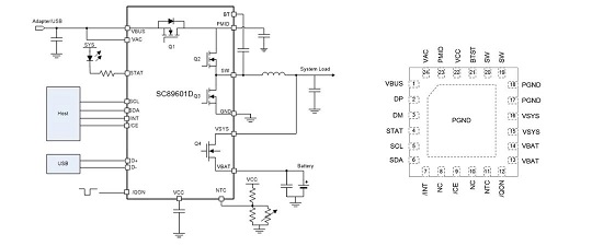 SC89601D采用QFN 4X4-24 封裝,輸入支持高達(dá)22V 耐壓。芯片集成了反向阻斷管(RBFET),降壓功率管(HSFET及LSFET),功率路徑管理管(BATFET),功率管驅(qū)動(dòng)供電和電路,大幅度簡(jiǎn)化了系統(tǒng)設(shè)計(jì)。MCU可通過I2C 接口靈活配置充電參數(shù),SC89601D支持3A充電電流,及1.2A 反向OTG 電流。
