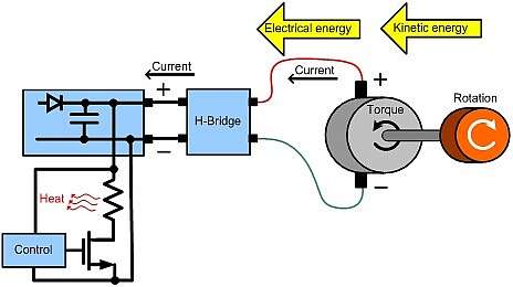 當(dāng)控制系統(tǒng)想要快速降低電機(jī)速度時,施加到電機(jī)的電流極性會反轉(zhuǎn)以提供與運(yùn)動相反的扭矩。完成后,存儲的動能可以通過電機(jī)驅(qū)動電路驅(qū)動回電源。