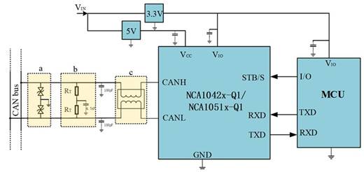 由于汽車系統(tǒng)ESD要求較高,通常在靠近總線接口處放置小寄生電容的專用ESD防護器件(a框, 如PESD2CAN,可以有效增強芯片的ESD防護能力。
