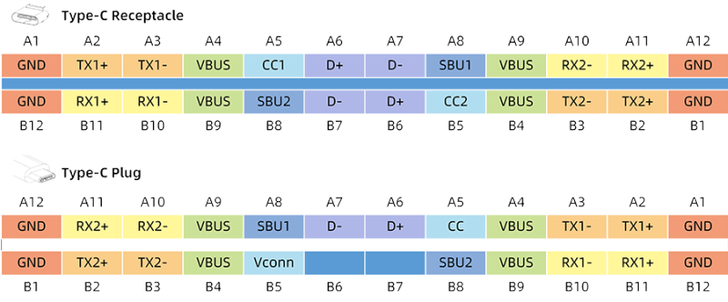 上圖中上半部分是Type-C母頭,下半部分是Type-C公頭,公頭比母頭少一組D+D-,這個設(shè)計是為了方便正反插。其中: