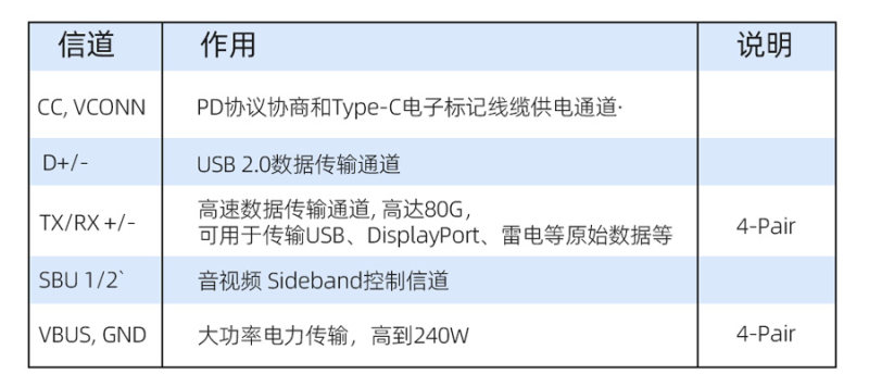 USB Type-C作為一種更為先進(jìn)的物理接口,全功能滿PIN (24PIN)下可以提供多種控制及傳輸通道,在PD協(xié)議的配合下,可進(jìn)行電力協(xié)商及接口工作模式的協(xié)商,從而啟用相應(yīng)的通道功能。