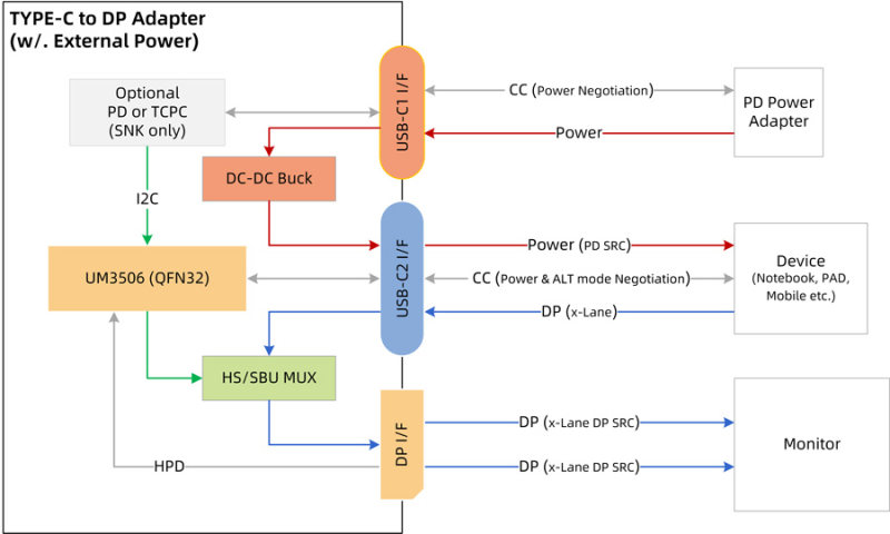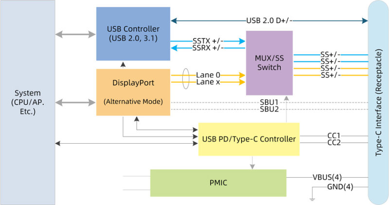 從以下的功能框圖看到,主機(jī)系統(tǒng)中USB和DP控制器,MUX/SS Switch,PD控制器,乃至電源控制器均是協(xié)同工作。其中的高速數(shù)據(jù)都是USB Host控制器以及 DP Source控制器的源格式。