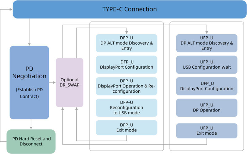 Type-C DP ALT模式協(xié)商流程都是通過USB PD協(xié)議的通信功能來完成,它是采用PD協(xié)議中VDM(Vender-Define message)的協(xié)議交互讓相連的設(shè)備進(jìn)入 DP等數(shù)據(jù)傳輸功能。