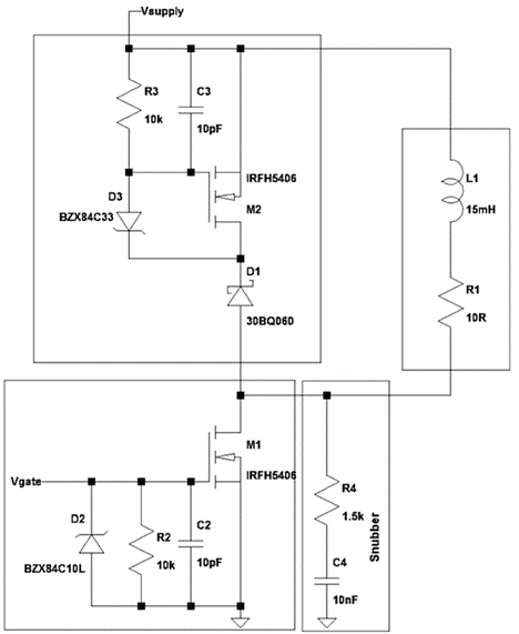電阻器 R2 和 R3 用于為晶體管的柵極放電,以在電源出現(xiàn)故障時將其關(guān)閉。齊納二極管 D2 限制 M1 的柵極電壓。C2 和 C3 用于降低dV DS /dt,以避免閂鎖。M1 的柵極連接到控制信號以關(guān)閉或打開負載。只要負載電壓約為 50V,鉗位晶體管 M2 就會導(dǎo)通。二極管 D1 用于阻止 M2 的體二極管導(dǎo)通。二極管 D3 增加鉗位電壓,從而實現(xiàn)快速關(guān)斷。關(guān)閉時間由以下等式給出: