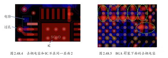 常見的 BGA封裝,其去耦電容通常放在 BGA下面,即背面。由于 BGA 封裝引腳密度大,因此去 耦電容一般放的不是很多,但應(yīng)盡量多擺放一些,如圖2.48.5所示。