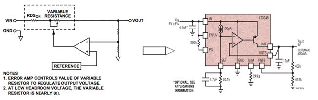 在芯片系列中有線性穩(wěn)壓器(LDO)和開關(guān)電源(DC/DC)。LDO看似簡單,實(shí)際非常重要。例如,將負(fù)載與不干凈的電源隔離或者構(gòu)建低噪聲電源來為敏感電路供電。LDO電路簡單,只能做降壓,低紋波噪聲,快速瞬態(tài)響應(yīng)。