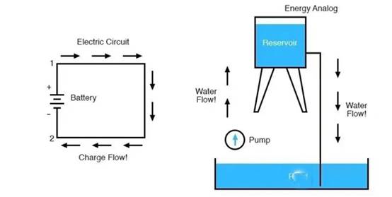 為了幫助理解電壓,圖2 顯示了電路和電荷流的示例圖,以及一個(gè)有用的類比。