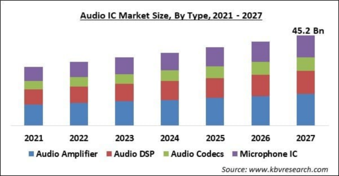 2021年,全球音頻芯片市場的收入規(guī)模為298.83億美元。隨著消費(fèi)者對于音質(zhì)要求的逐漸提高,個人便攜式電子產(chǎn)品、智能終端電子產(chǎn)品的更新?lián)Q代,無線音箱的市場需求在逐步提升,受下游市場多元化需求的拉動,相應(yīng)的音頻芯片需求也在逐步提升。根據(jù)Reportlinker預(yù)測,2022年至2027年,全球音頻驅(qū)動器IC市場將增長31.28億美元,在預(yù)測期內(nèi)以15.86%的復(fù)合年增長率加速增長。