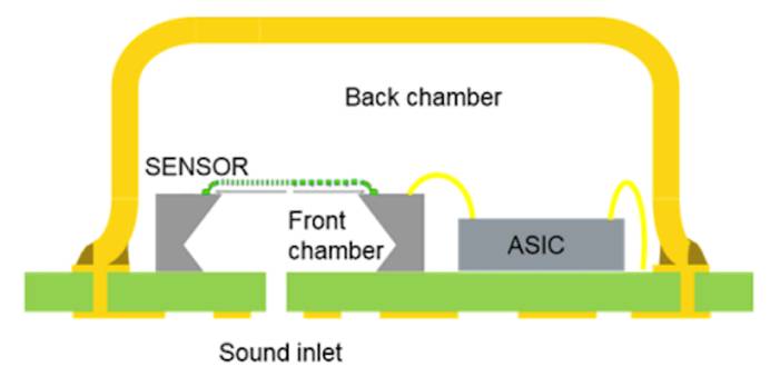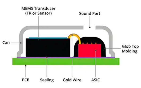 麥克風(fēng)元件及其電路不在同一硅芯片上。他們的制造技術(shù)差異太大,無法將它們制造在一起。相反,麥克風(fēng)和單獨(dú)的 ASIC(專用集成電路)組合在同一個(gè)封裝中,通過引線鍵合連接,如圖 5 所示。
