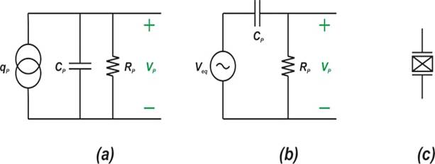 圖 1. 壓電傳感器的兩個示例電路模型 (a) (b) 及其原理圖符號 (c)。