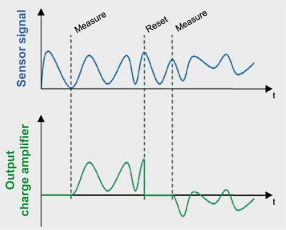 同樣,上部曲線顯示傳感器產(chǎn)生的電荷,下部曲線描述電荷放大器的輸出。請注意,當開關打開時,輸出為零。結果,復位開關也為隨后的測量固定了零點。