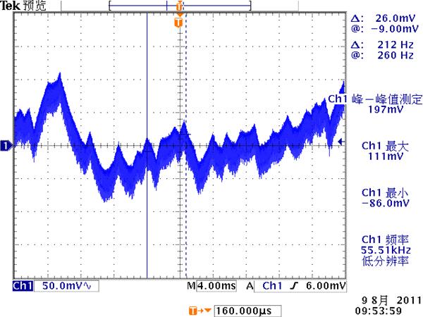 低頻紋波是與輸出電路的濾波電容容量相關(guān)。由于開關(guān)電源體積的限制,電解電容的容量不可能無限制地增加,導(dǎo)致輸出低頻紋波的殘留,該輸出紋波頻率隨整流電路方式的不同而不同。