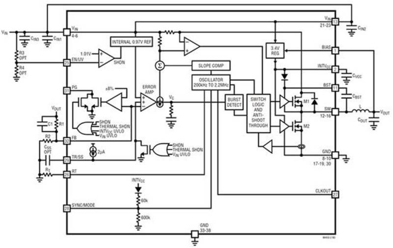 圖 1:Silent Switcher 降壓穩(wěn)壓器的方框圖展示了它們的復(fù)雜度,但無法顯示用于實現(xiàn)重大性能改進的技術(shù)細(xì)節(jié)。(圖片來源:Analog Devices)
