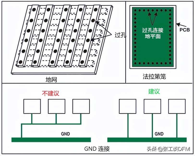 在PCB設(shè)計(jì)中最常用的就是低電感接地系統(tǒng)。最大化PCB上的接地面積可以降低系統(tǒng)中的接地電感,這樣可以減少電磁輻射和干擾,可以使用不同的方法將信號接地。