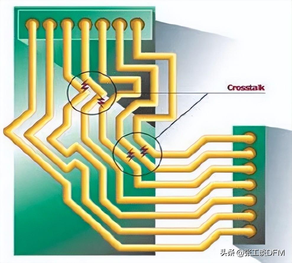 串?dāng)_干擾是指一根信號線對相鄰信號線的干擾,通常發(fā)生在相鄰的電路和導(dǎo)體上,其特點(diǎn)是電路與導(dǎo)體之間存在互電容和互阻抗。例如:PCB上的帶狀線,信號電平較低,當(dāng)平行線長度超過10cm時(shí),串?dāng)_就會出現(xiàn)。