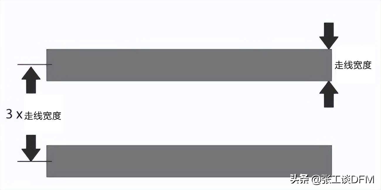 走線分離可最大限度地減少相同或不同 PCB 層上相鄰/平行跡線之間的串?dāng)_和電磁耦合。一般規(guī)則規(guī)定走線之間的間隔(在中心到中心之間測量)應(yīng)大于或等于 3 x 走線寬度。間隔越大,串?dāng)_和耦合越低。