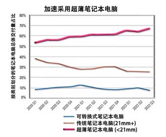在工作環(huán)境中,人們使用筆記本電腦的方式不斷發(fā)生意想不到的變化。疫情使得遠(yuǎn)程辦公已成為一種常態(tài)化。而在各種遠(yuǎn)程位置的混合辦公環(huán)境這一趨勢(shì)則推動(dòng)了對(duì)便攜性和更佳音頻體驗(yàn)的更高偏好。根據(jù) IDC PCD Tracker Historical 2022年第三季度報(bào)告(圖1所示),行業(yè)正在加速采用超薄筆記本電腦。