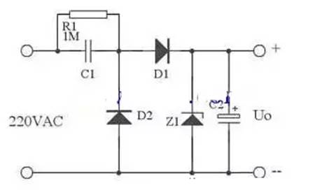 下圖為阻容降壓的典型應(yīng)用,C1為降壓電容,R1為斷開(kāi)電源時(shí)C1的泄放電阻,D1為半波整流二極管,D2在市電的負(fù)半周為C1提供放電回路,否則電容C1充滿電就不工作了,Z1為穩(wěn)壓二極管,C2為濾波電容。輸出為穩(wěn)壓二極管Z1的穩(wěn)定電壓值。