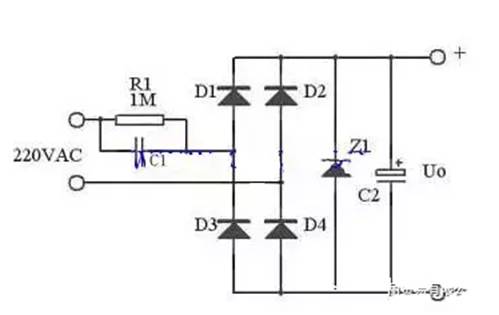 在實(shí)際應(yīng)用中,可以用下圖代替上圖,這里用了Z1正向特性和反向特性,其反向特性(也就是其穩(wěn)壓特性)來(lái)穩(wěn)定電壓,其正向特性用來(lái)在市電負(fù)半周給C1提供放電回路。