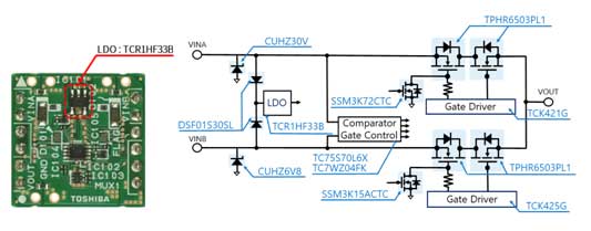圖2:電源多路復(fù)用器電路模塊板及簡易方框圖