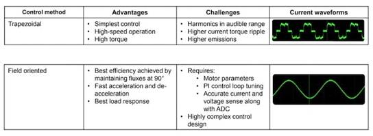 用于控制 BLDC 電機(jī)的兩種控制方案各有優(yōu)缺點(diǎn)。每種方法都會(huì)產(chǎn)生有助于聲學(xué)噪聲的諧波偽影。