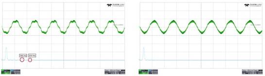 在 MCF8316A 內(nèi)部啟用死區(qū)時(shí)間補(bǔ)償可消除可聽諧波(左),從而產(chǎn)生更純凈的正弦信號(hào)(右)。截圖由Texas Instruments提供
