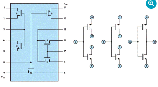 為了在本實驗活動中構(gòu)建邏輯功能,需要使用 ADALP2000模擬部件套件中的CD4007 CMOS陣列和分立式NMOS和PMOS晶體管(ZVN2110A NMOS和ZVP2110A PMOS)。CD4007由3對互補MOSFET組成,如圖1所示。每對共用一個柵極(引腳6、3和10)。所有PMOSFET(正電源引腳14)以及NMOSFET(地引腳7)的襯底都共用。左邊一對,NMOS源極引腳連接到NMOS襯底(引腳7),PMOS源極引腳連接到PMOS襯底(引腳14)。另外兩對均為通用型。右邊一對,NMOS的漏極引腳連接到PMOS的漏極引腳,即引腳12。