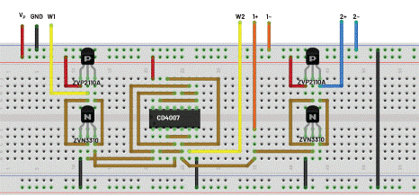 使用四個獨立NMOS和PMOS晶體管(ZVN2110A和ZVP2110A)構(gòu)建的反相器對也可以由第二個CD4007 IC構(gòu)成,或者可以是采用六路反相器IC的CMOS反相器,如74HC04或CD4049。CD4066四通道SPST開關也可以作為采用CD4007構(gòu)建的開關的替代器件。