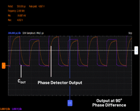 當XOR門鑒相器用于PLL系統(tǒng)時,它通常鎖定在相位檢測范圍中間的90°相位差附近。在90°時,XOR具有50%占空比的方波輸出,輸出頻率是輸入頻率的兩倍。方波占空比根據(jù)兩個輸入信號的相位差發(fā)生變化。XOR門的輸出通過低通濾波器產(chǎn)生的模擬電壓與兩個信號之間的相位差成正比。它需要對稱的方波輸入。如果一個輸入的占空比與另一個輸入的占空比略有不同,則低通濾波輸出將會偏移90°相位差時的理想中間范圍。