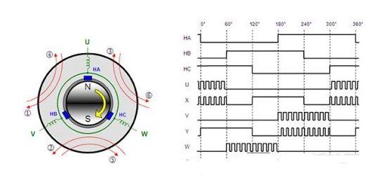 換向由轉子和定子的相對位置確定,具體則通過霍爾效應傳感器測量,或通過電機轉動時生成的反電動勢 (EMF) 幅度測量(限無傳感器電機)。
