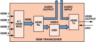 以 ADV7623 為例,這款 HDMI 收發(fā)器集成了 4:1  HDMI 輸入多路復(fù)用器 (mux )、 HDMI 接收器、 屏幕顯示 (OSD)引擎和 HDMI 發(fā)射器。就個體而言, 上述每種功能應(yīng)該都需要彼此 獨(dú)立的 IC 及五花八門的固件,但一個收發(fā)器就可以將全部功能組合到一個綜合解決方案中, 節(jié)省了板載面積、降低了固件 復(fù)雜程度、縮減了物料成本, 為家庭影院系統(tǒng)設(shè)計(jì)人員帶來了 極大方便。