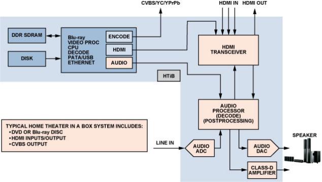 HTiB  屬于完整的視頻播放系統(tǒng),一般采用多通道音頻放大器 和環(huán)繞聲音響系統(tǒng)來播放音頻。此外, 該系統(tǒng)通常還包括一個 DVD 或 Blu-ray™視頻播放機(jī)。HTiB 簡化了視頻播放機(jī)、放大 器和揚(yáng)聲器的安裝和功率匹配, 它主要處理音頻, 視頻則通過 HDMI 接口傳送給電視機(jī)。圖 2 所示為一個典型的 HTiB 系統(tǒng)。