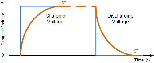 根據(jù)輸入電壓,電容器兩端的電壓降在充電至Vc和放電至零之間交替。在此示例中,輸入方波電壓波形的頻率(以及由此產(chǎn)生的時(shí)間周期f = 1/T )與5RC時(shí)間常數(shù)的兩倍完全匹配。