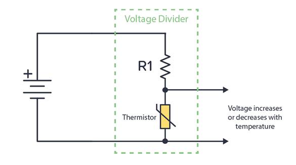 分壓電路的一個(gè)典型案例是用于模擬傳感器。例如,熱敏電阻是溫度傳感器。它會(huì)根據(jù)溫度改變其電阻。如果將其與分壓電路中的已知電阻值連接,我們就能獲得取決于溫度的電壓: