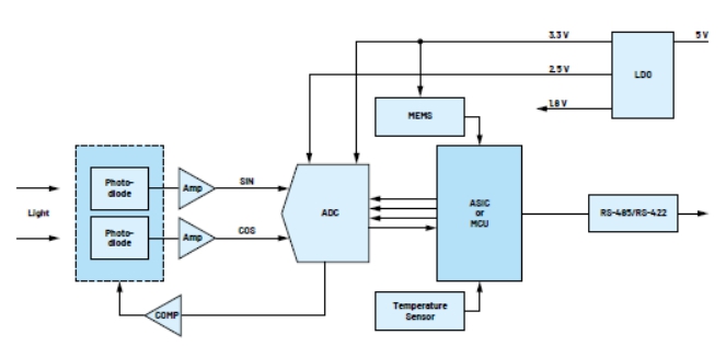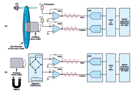 編碼器通過(guò)跟蹤旋轉(zhuǎn)軸的速度和位置來(lái)提供閉環(huán)反饋信號(hào)。光學(xué)和磁編碼器技術(shù)使用非常廣泛,如圖2所示。在通用伺服驅(qū)動(dòng)器中,編碼器用于測(cè)量軸位置,從中可推導(dǎo)出驅(qū)動(dòng)器轉(zhuǎn)速。機(jī)器人和離散控制系統(tǒng)需要準(zhǔn)確且可重復(fù)的軸位置。光學(xué)編碼器由帶有精細(xì)光刻槽的玻璃圓盤組成。當(dāng)光穿過(guò)圓盤或從圓盤反射時(shí),光電二極管傳感器檢測(cè)光的變化。光電二極管的模擬輸出經(jīng)過(guò)放大和數(shù)字化處理后,通過(guò)有線電纜發(fā)送到逆變器控制器。磁編碼器由安裝在電機(jī)軸上的磁體和磁場(chǎng)傳感器組成,傳感器提供正弦和余弦模擬輸出,輸出經(jīng)過(guò)放大和數(shù)字化處理。光學(xué)和磁傳感器信號(hào)鏈類似,如圖2所示。