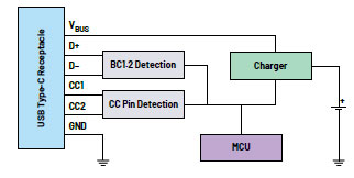 BC1.2檢測IC支持傳統(tǒng)的USB適配器。雖然更新的設(shè)備更廣泛地采用USB Type-C,但許多應(yīng)用仍然使用舊的USB規(guī)格。BC1.2兼容端口采用D+/D-引腳來傳輸電源的功率容量,而不是CC引腳。BC1.2檢測IC讀取D+/D-引腳,為仍然使用傳統(tǒng)USB標(biāo)準(zhǔn)的應(yīng)用配置充電。