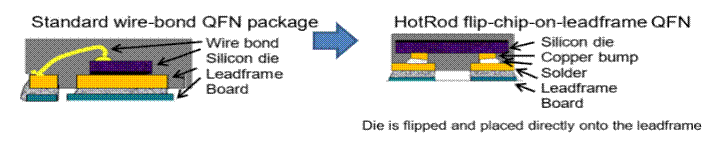 還有一些封裝級功能有助于抑制 EMI。TI 的 HotRod 封裝就是一個例子,它消除了內(nèi)部鍵合線,如圖 1所示 。不連續(xù)電流會導(dǎo)致開關(guān)節(jié)點產(chǎn)生數(shù)百兆赫茲的振鈴,從而產(chǎn)生耦合和輻射,從而產(chǎn)生 EMI。去除輸入電容器不連續(xù)電流的高 di/dt 環(huán)路路徑中的鍵合線可降低環(huán)路電感。這反過來又減少了振鈴中的能量,從而降低了 EMI。LM61460-Q1 和 LM53635-Q1等器件 采用 HotRod 封裝。
