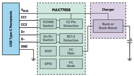 獨(dú)立PD控制器的一個(gè)示例是MAX77958(圖4)。MAX77958具有兩個(gè)獨(dú)特功能:非易失性存儲(chǔ)器和直接控制配套充電器的I 2 C主端口。這兩個(gè)功能消除了對(duì)外部MCU的需求,也無需開發(fā)定制固件。