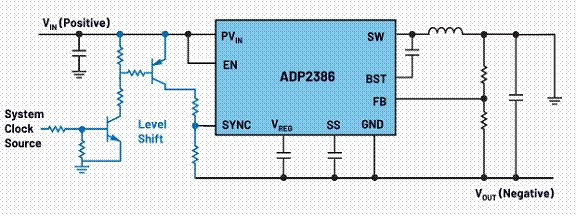 反相降壓-升壓電路產(chǎn)生的負(fù)電壓幅度可以高于或低于可用正電壓的幅度。例如,從+12 V可以生成-8 V,甚至-14 V。當(dāng)使用具有反相降壓-升壓電路的開關(guān)穩(wěn)壓器IC時(shí),系統(tǒng)可能需要設(shè)計(jì)通信引腳。如果確實(shí)需要,設(shè)計(jì)人員必須進(jìn)行充分的電平轉(zhuǎn)換,以便可以利用同步和使能信號(hào)。
