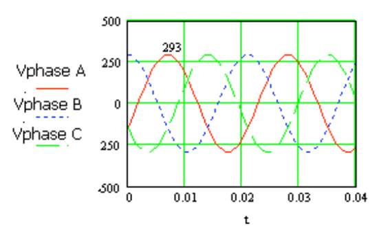 圖 2 208VAC/60Hz 系統(tǒng)的各相電壓與時間的關系