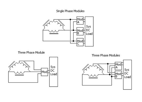 單相模塊具有更簡單、更高效的電源轉換電路的優(yōu)點,但為了完全平衡線路電流,電源轉換器必須以三的倍數(shù)來實現(xiàn)。在各個電源模塊尺寸和整體系統(tǒng)負載之間找到合適的配合有時可能具有挑戰(zhàn)性。如果模塊為公共負載供電,則必須在模塊之間采用功率共享電路,以確保從每相汲取的功率相等。功率共享電路可以采用“下垂”共享電路的形式,其中小的非耗散合成阻抗與每個模塊的輸出串聯(lián)添加。這將迫使模塊共享電流,就好像一個單元的電流大于其他單元一樣,其輸出電壓將下降,直到其負載電流與系統(tǒng)中的其他單元匹配;蛘撸瑔尉,