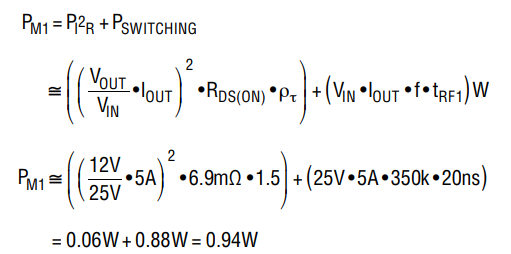 可通過選擇一個較低的開關(guān)頻率來降低 0.88W 的最大開關(guān)功耗。由于該計(jì)算是近似的,因此應(yīng)在 PCB 上測量實(shí)際的上升和下降時間以獲得更好的功耗估計(jì)。當(dāng)電路工作于降壓區(qū)時,M2 中的最大功率耗散出現(xiàn)在最大輸入電壓下。若采用 6.9mΩ  FDMS7672,則功率耗散為: