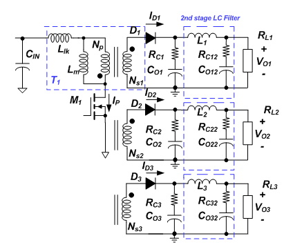 或者,增加LC濾波電路的輸出級可以顯著降低輸出紋波。圖 2 說明了使用第二級 LC 濾波器的反激式。