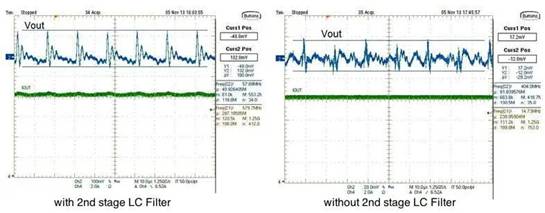 不帶第二級 LC 濾波器的輸出紋波與不帶第二級 LC 濾波器的輸出紋波。