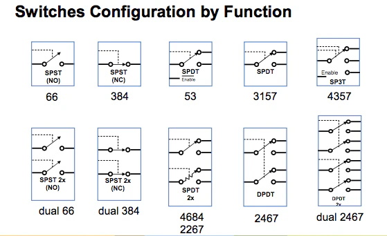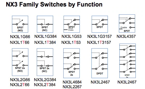 極數(shù)表示公共端子(或活動觸點)的數(shù)量,而擲數(shù)表示公共側可以連接的備用端子的數(shù)量。每個封裝中的開關可以是單開關、雙開關或多個開關(通常是偶數(shù))。這些開關可以單獨激活,也可以同時激活。恩智浦高性能模擬開關產(chǎn)品組合包含采用上述每種配置的設備。NX3 系列提供所有標準配置 SPST、SPDT……單、雙、四。