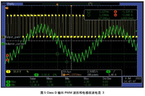 在上圖中綠色波形為流過電感電流,黃色波形為音頻功放輸出 PWM 波形。
