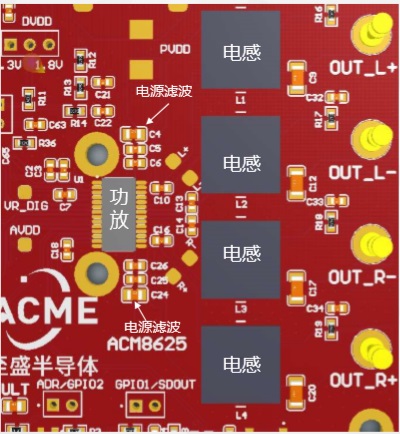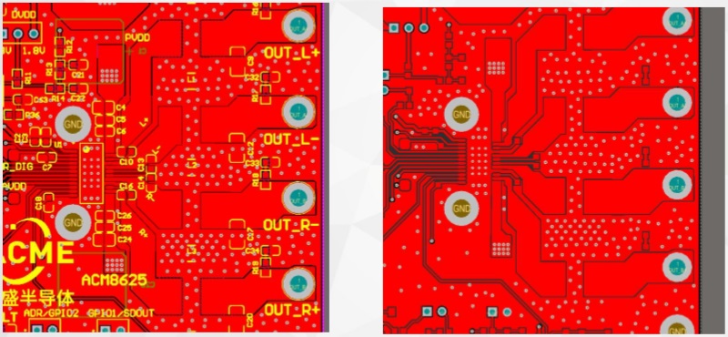 1)PCB板布局過于緊湊,功率密度太大,狹小的空間內(nèi)布局2顆ACM8625P功放.