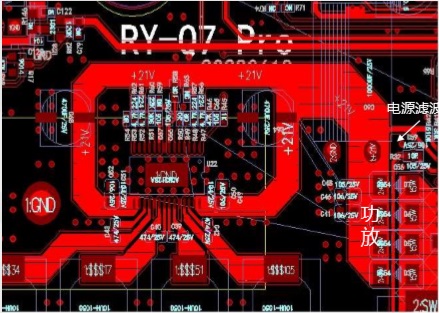 1)兩層PCB板設(shè)計(jì),PVDD電源將功放周邊的GND銅皮切割成孤島.