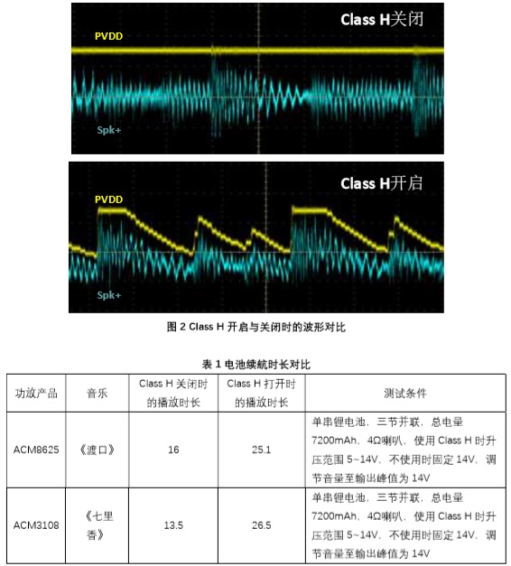 對(duì)于便攜式音頻系統(tǒng),如便攜式藍(lán)牙音箱、拉桿音箱等,Class H技術(shù)可在相同的電池容量下,大幅提高續(xù)航時(shí)間,對(duì)于降低產(chǎn)品內(nèi)部溫升亦有幫助。表1展示了同一套系統(tǒng),在音樂(lè)、音量都相同的情況下,打開(kāi)或關(guān)閉Class H 功能的對(duì)比實(shí)測(cè)結(jié)果。當(dāng)關(guān)閉Class H 功能時(shí),boost輸出電壓保持在最大音頻功率所對(duì)應(yīng)的最高值。